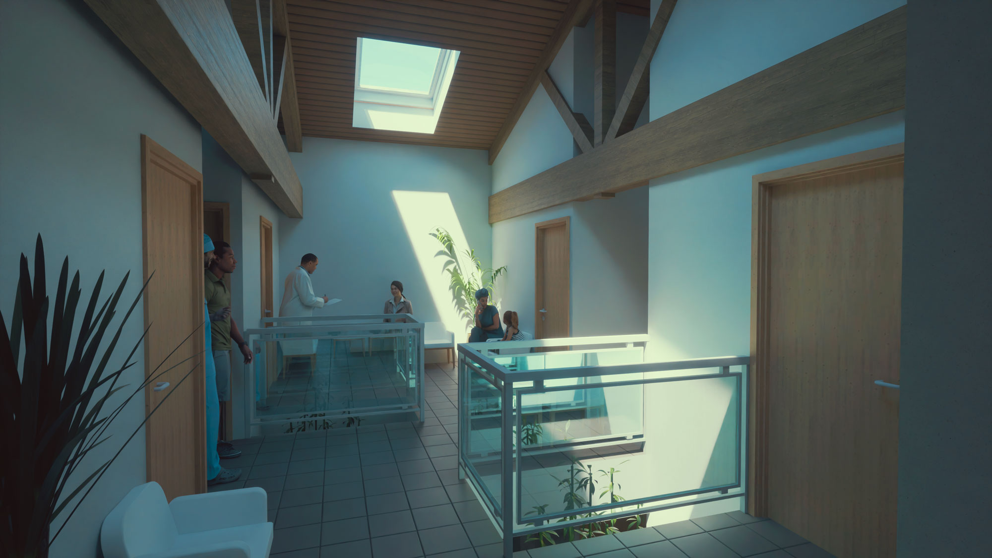 Rez-de-chaussée : salles de consultation pour médecins généralistes et internes.